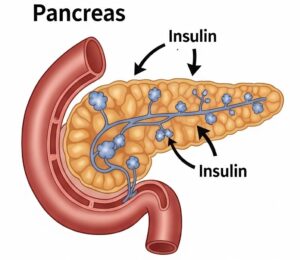 Diabetes is a long-term condition where the body can’t use sugar (glucose) the right way. The body makes a hormone called insulin in the pancreas. Insulin’s job is to move sugar (glucose) from your blood into your cells so your body can use it for energy or store it for later. When your body doesn’t make enough insulin or can’t use it properly, sugar stays in the blood instead of going into the cells. This causes high blood sugar, which can cause health problems over time.