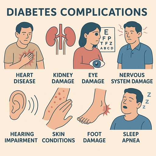 Treatment:Â Treatment typically starts with lifestyle changes like adopting a healthier diet, exercising regularly, and losing weight. Oral medications such as metformin are commonly used, and insulin therapy may become necessary as the disease progresses. With proper management, people with Type 2 diabetes can prevent or delay complications, but if left uncontrolled, it can lead to serious issues such as heart disease, kidney failure, nerve damage, and vision loss.