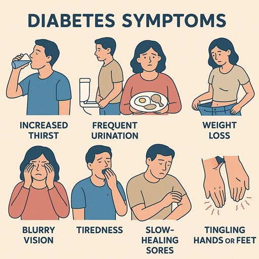 Symptoms: Symptoms of Type 2 diabetes often develop slowly and can include increased thirst and hunger, frequent urination, fatigue, blurred vision, slow healing wounds, and numbness or tingling in the hands or feet. Many people may not realize they have it until complications arise.Â